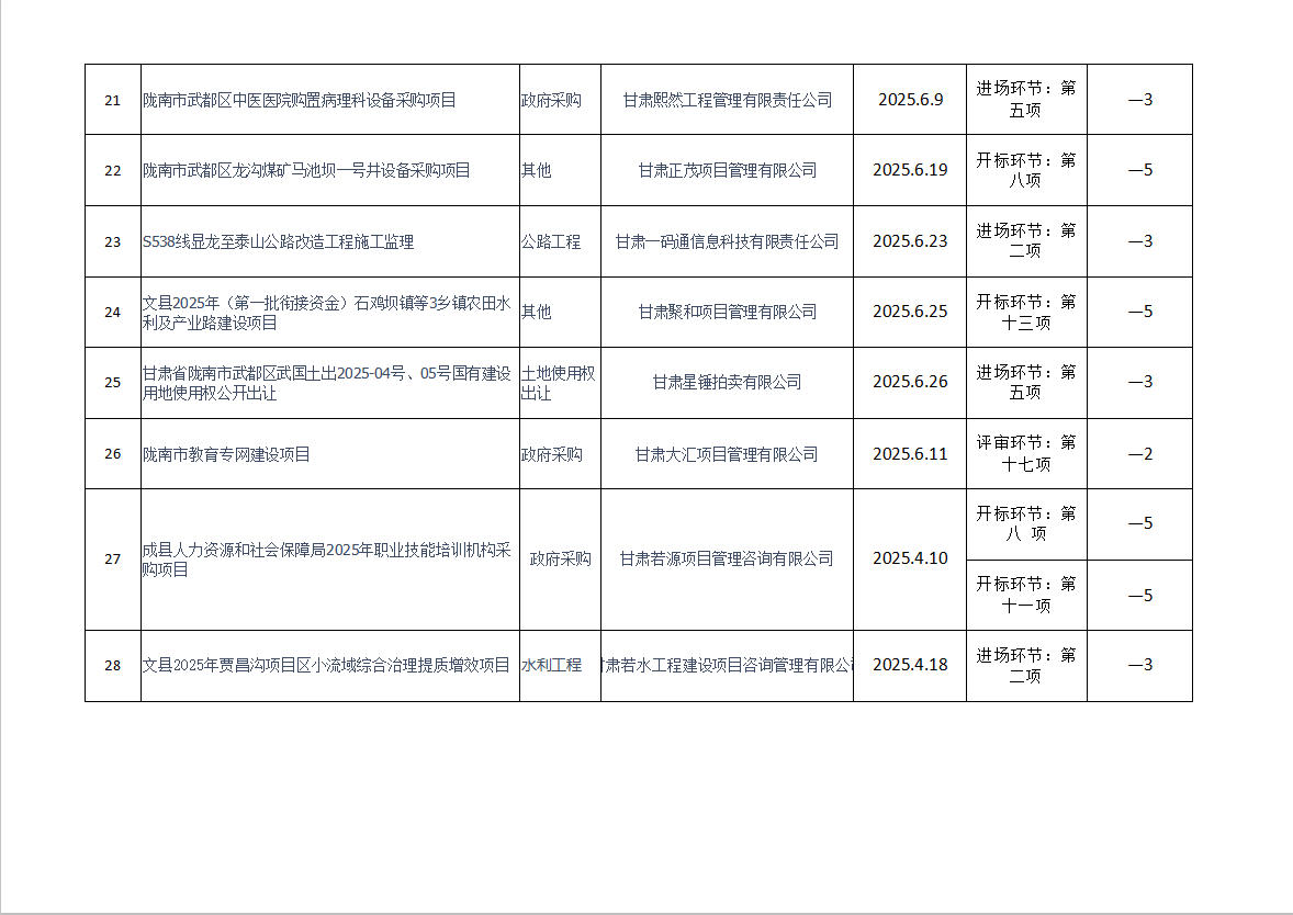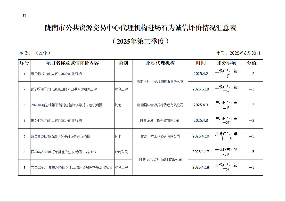 根據(jù)《隴南市公共資源交易中心代理機構進場行為誠信評價實施制度(試行)》規(guī)定,現(xiàn)對2025年第二季度共22家代理機構28條進場行為誠信評價記錄予以通報(詳見附表)。請各代理機構嚴格遵守各項規(guī)章制度、誠實守信,規(guī)范操作,為招標人和采購人提供專業(yè)、高效、規(guī)范的招標代理服務。