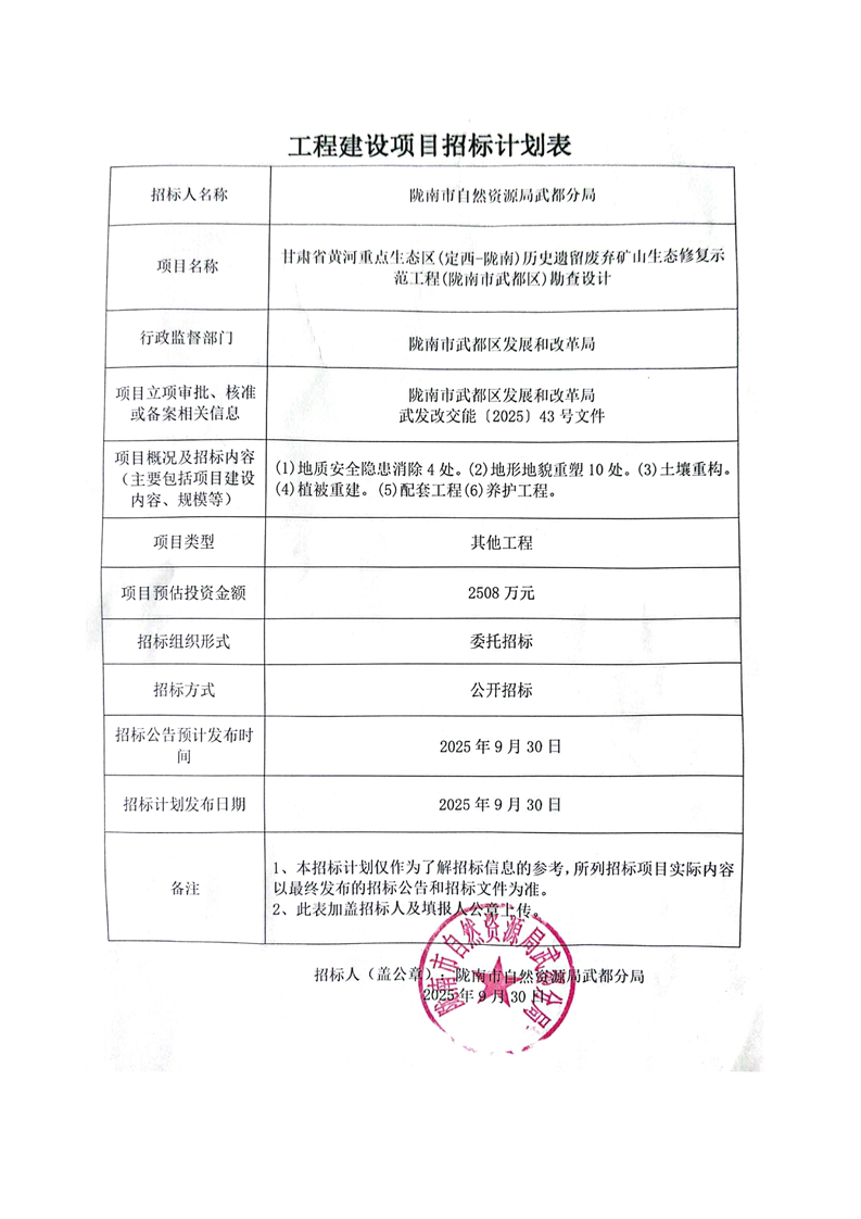 甘肅省黃河重點(diǎn)生態(tài)區(qū)(定西-隴南)歷史遺留廢棄礦山生態(tài)修復(fù)示范工程(隴南市武都區(qū))勘查設(shè)計(jì)