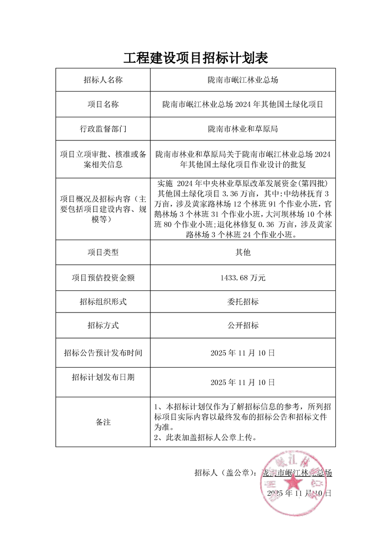 隴南市岷江林業(yè)總場2024年其他國土綠化項(xiàng)目