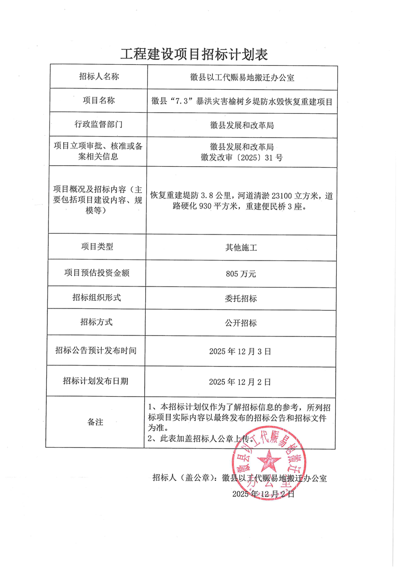 徽縣“7.3”暴洪災(zāi)害榆樹鄉(xiāng)堤防水毀恢復(fù)重建項(xiàng)目