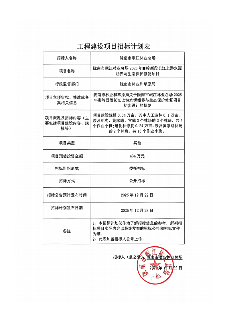 隴南市岷江林業(yè)總場2025年秦嶺西段長江上游水源涵養(yǎng)與生態(tài)保護修復項目