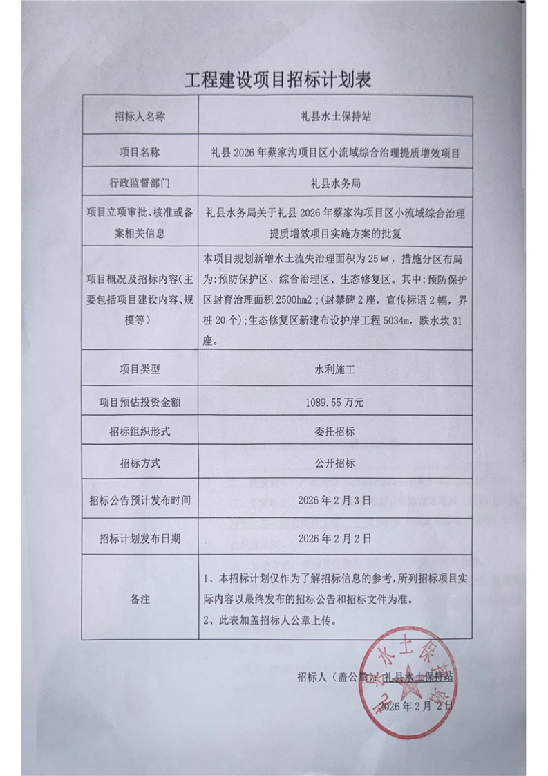 禮縣2026年蔡家溝項目區(qū)小流域綜合治理提質增效項目