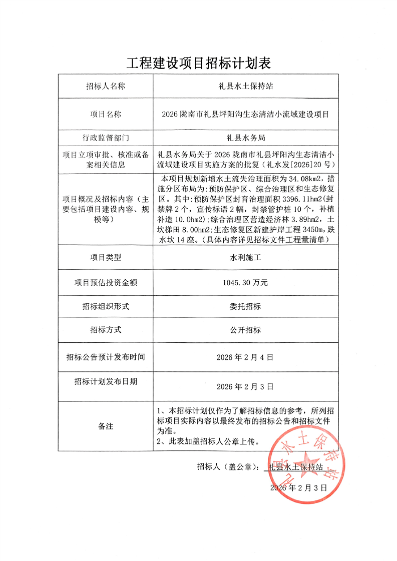 2026隴南市禮縣坪陽溝生態(tài)清潔小流域建設(shè)項目