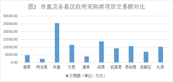 2.政府采購類項(xiàng)目:市直45項(xiàng),交易額25563.29萬元;武都區(qū)36項(xiàng),交易額6990.89萬元;成縣34項(xiàng),交易額13577.85萬元;徽縣20項(xiàng),交易額4778.48萬元;西和縣34項(xiàng),交易額10655.60萬元;禮縣35項(xiàng),交易額10150.20萬元;康縣23項(xiàng),交易額3886.56萬元;文縣36項(xiàng),交易額11436.30萬元;宕昌縣35項(xiàng),交易額9173.00萬元;兩當(dāng)縣14項(xiàng),交易額2284.08萬元。