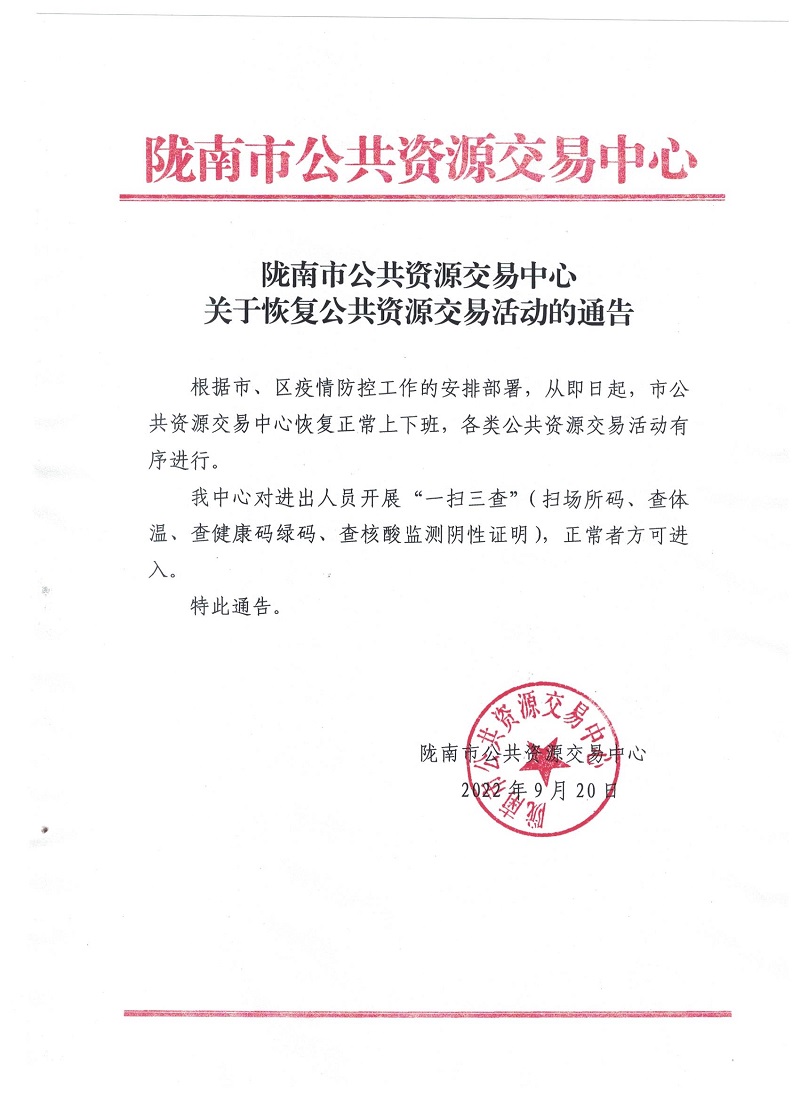 隴南市公共資源交易中心關(guān)于恢復(fù)公共資源交易活動(dòng)的通知